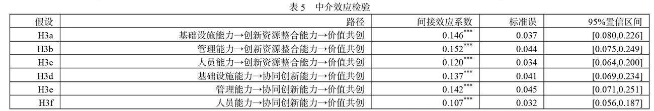本研究采用Bootstrap技术来检验动态创新能力效应的中介作用。根据此方法,计算95%的置信区间,若置信区间不包含0,就可以证明中介效应的结果是显著的。本文将大数据分析能力、动态创新能力与价值共创进行了路径分析,分析结果如表5所示。可知各个路径的上下区间均不通过0,说明假设H3a-H3f通过了显著性检验。
