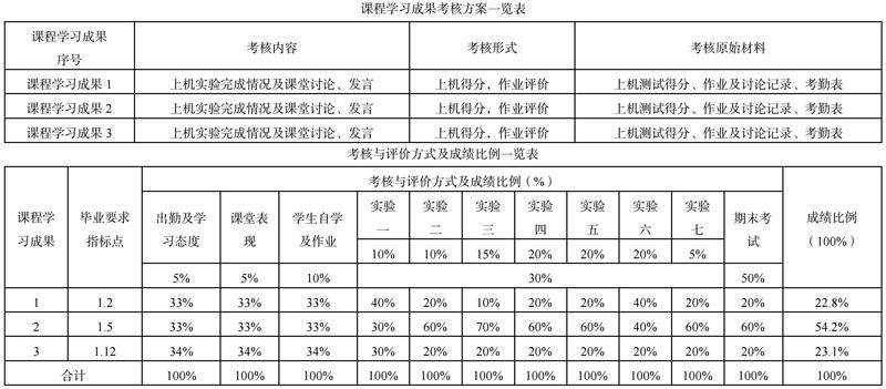 《课程学习成果考核方案一览表》表达的对应关系,能够证明学生通过本课程考核成绩合格,即可达到课程学习成果的要求。《考核与评价方式及成绩比例一览表》对课程学习成果进行了深入分解,将三大块课程学习成果分解到了每一项考核之中,出勤及学习态度、课堂表现、学生自学及作业、实验1-7、期末机考在各学习成果中占不同比例。