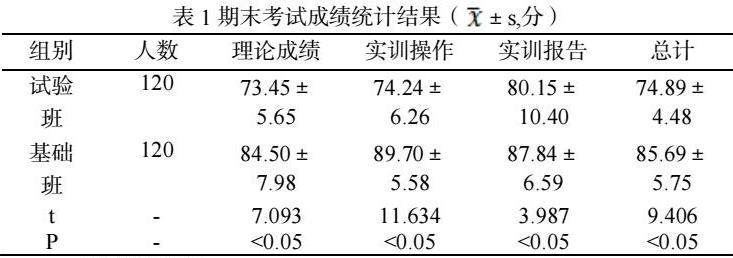试验班期末考试成绩(85.69±5.75)高于基础班(85.69±5.75),分数对比结果为P<0.05。