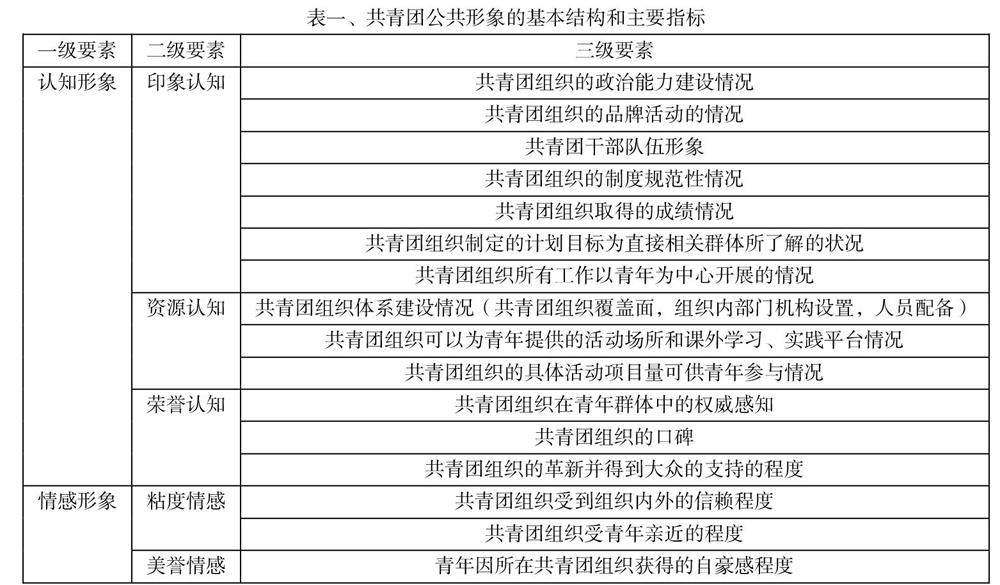 基于此,共青团组织的公共形象是政治性和社会性结合的形象,是人们通过与该组织各要素或某些部分的互动和交流而获得的该组织信息或数据,并依靠大众互相传递进而在个体头脑中产生的自然的、自发的或由此产生的形象,并形成内在稳定的认知、表征、情感和愿景。