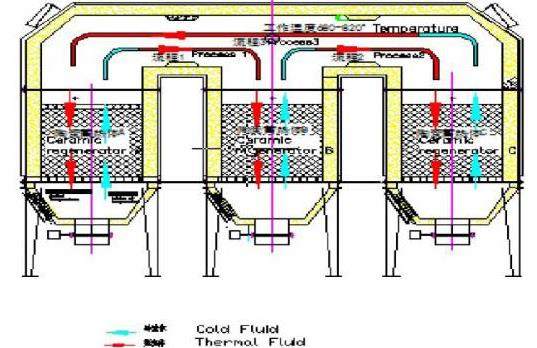 在正常运行阶段,废气首先进入蓄热室A进行预热,使其达到约850度左右,预热后的废气进入燃烧室进行燃烧。在助燃燃料的作用下,废气中所含有机物能够充分分解燃烧,使燃烧温度始终稳定在约900度左右,烟气则进入蓄热室C放热。