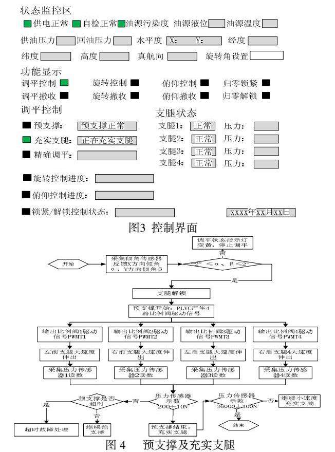 发射车控制系统接收显控面板的控制命令并实时反馈发射车状态。调平控制过程中,PLVC控制器接收来自显控面板的功能选择使能信号,进行自动调平控制流程。
