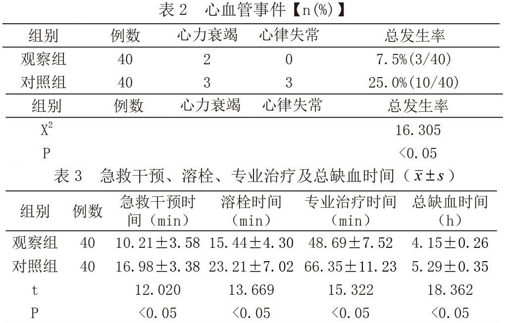 选取在2020年1月至2022年1月本院收治的80例急性ST段抬高型心肌梗死患者,随机分为观察组和对照组各40人。观察组男26例、女14例,平均年龄(68.32±8.84)岁;对照组男24例、女16例,平均年龄(67.21±8.01)岁。一般资料无差异,P>0.05。