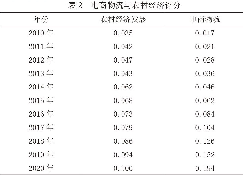 数据选取中,为保证数据准确性,选择2010~2020年统计数据,数据来自于《中国统计年鉴》,以熵权法处理数据,获得2010~2020年农村带你上物流和经济发展评分,见表2。