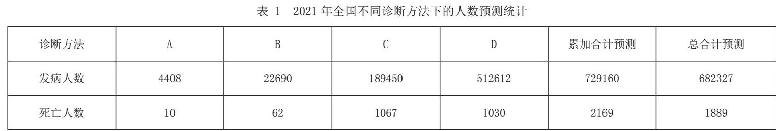 2)根据已获得2004年至2016年在不同诊断方法A、B、C、D下的发病人数、死亡人数的预测值,可得此预测数据值作为预测2021年全国感染肺结核发病人数和死亡人数的原始数列,通过灰色模型预测得表1的预测值。