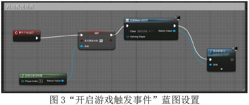 通过调整摄像机与角色的位置,实现了第一人称视角漫游,用户需用键盘W、A、S、D配合鼠标操作。实现这一步,只需在关卡蓝图中获取玩家控制器,事件开始运行时,玩家便可以开始漫游。蓝图设置如图6所示: