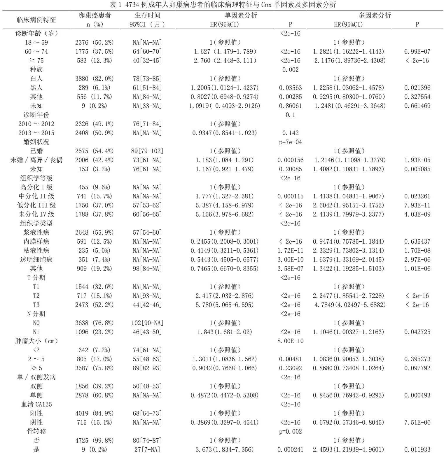 提取患者年龄、诊断年份、种族、婚姻、病理组织学分级、病理组织学类型、T分期(AJCC 第7版)和N分期(AJCC 第7版)、肿瘤病灶单双侧情况、肿瘤大小、术前血清学CA125水平、远处器官(骨、脑、肝、肺)转移、手术、化疗、放疗、生存状态、生存时间的信息进行分析。将年龄分成≤59岁、60-74岁、≥75岁组;诊断年份分成2010-2012年、2013-2015年组;婚姻状况分为:已婚、未婚/离异/丧偶组、未知组;种族分成白人、黑人、其他种族和未知;肿瘤大小分为<2cm,2-5cm,>5cm;组织学类型按照2014年《WHO女性生殖器官肿瘤分类》分为浆液性癌、内膜样癌、粘液性癌、透明细胞癌和其他癌[8]。