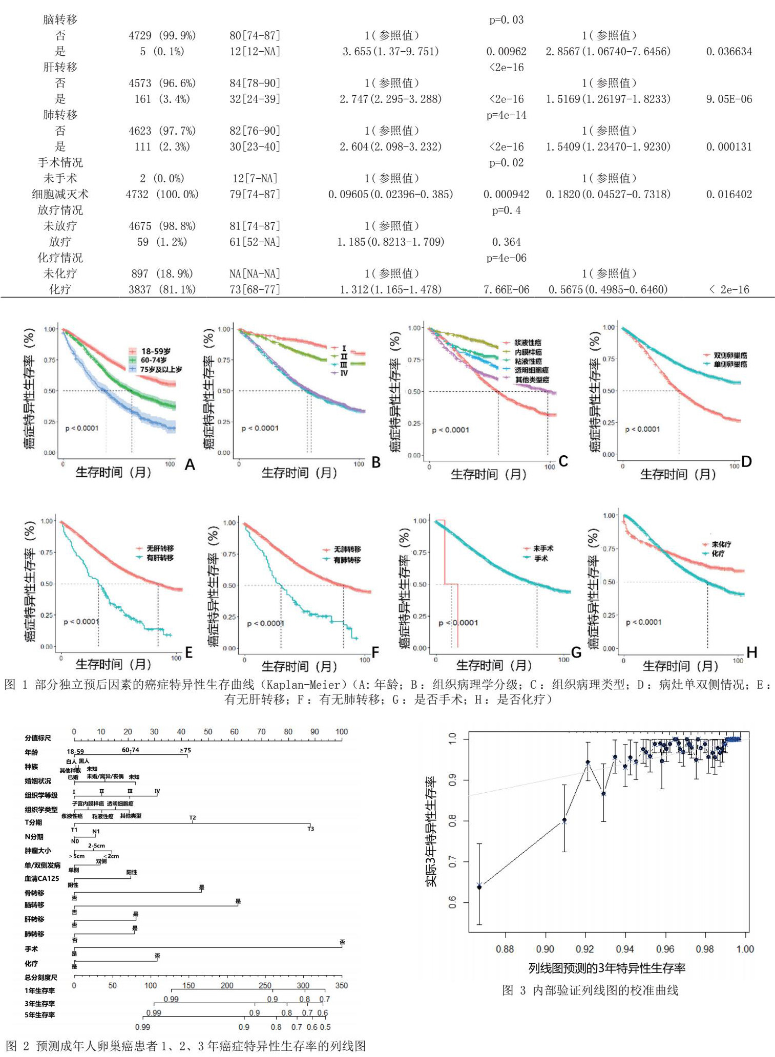 综上所述,年龄、婚姻状态、种族、组织分化、组织类型、T分期、N分期、肿瘤大小、病灶单双侧情况,术前血清学CA125水平、远处器官(骨、脑、肝、肺)转移、手术、化疗是影响预后的独立危险因素。基于以上因素建立的列线图能较为准确、直观地个体化、可视化预测成年人卵巢癌患者的生存率。