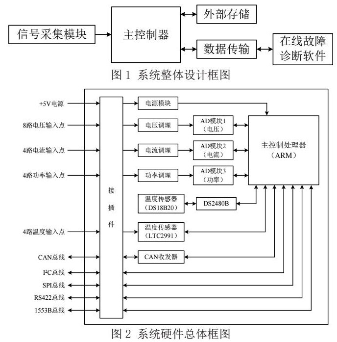 数据采集系统主要由硬件模块和软件模块两部分组成。系统硬件模块部分主要是由信号采集模块、数据传输模块、数据存储模块以及电源模块等组成;系统软件部分主要是由下位机控制程序以及上位机程序组成,下位机控制程序主要由多任务模块、数据采集服务、通信服务、系统功耗调理等程序组成,上位机程序则是在线故障诊断程序。整个采集系统主要是基于STM32构建的,与上位机采用RS422总线和CAN总线进行通信,系统采用μC/OS-III操作系统作为主控系统。数据采集系统的整体框图如图1.1所示。