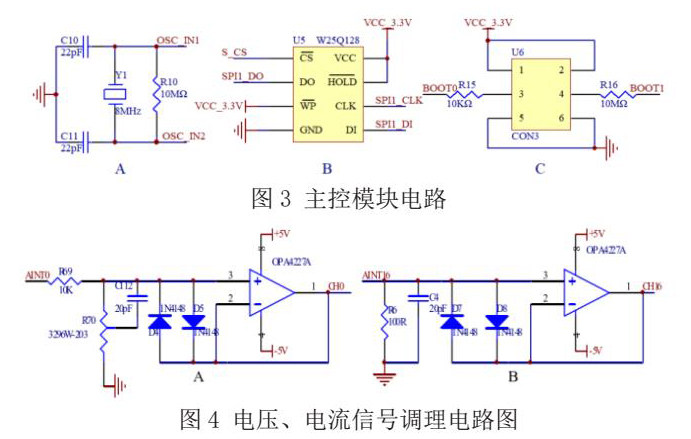 图4(B)为电流信号调理电路图。电路中串接采样电阻R6,电流最终转换为测采样电阻两端的电压差值,即I=U差/R,输入电流范围为0~50mA,经过电阻R6转换为电压,转换后的电压范围为0~5V。电流调理电路后端的作用和电压调理电路的作用一样,这里就不做过多赘述。