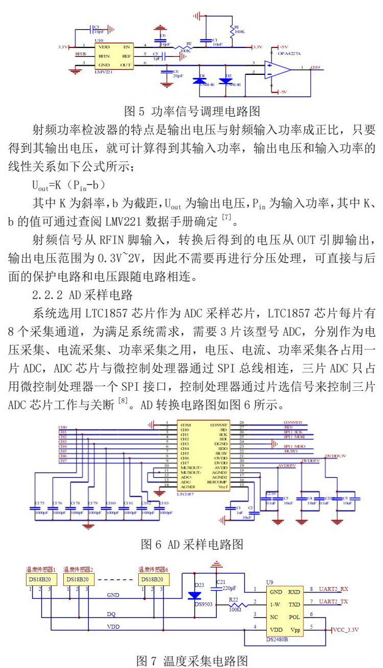 系统除了采集电压、电流信号外还需要采集射频功率信号,射频信号频率测量范围为50MHz~3.5GHz,功率范围为-45dBm~-5dBm。系统是通过射频功率检波器来对射频功率进行测量的,选用LMV221作为功率调理芯片,功率信号调理电路如图5所示。