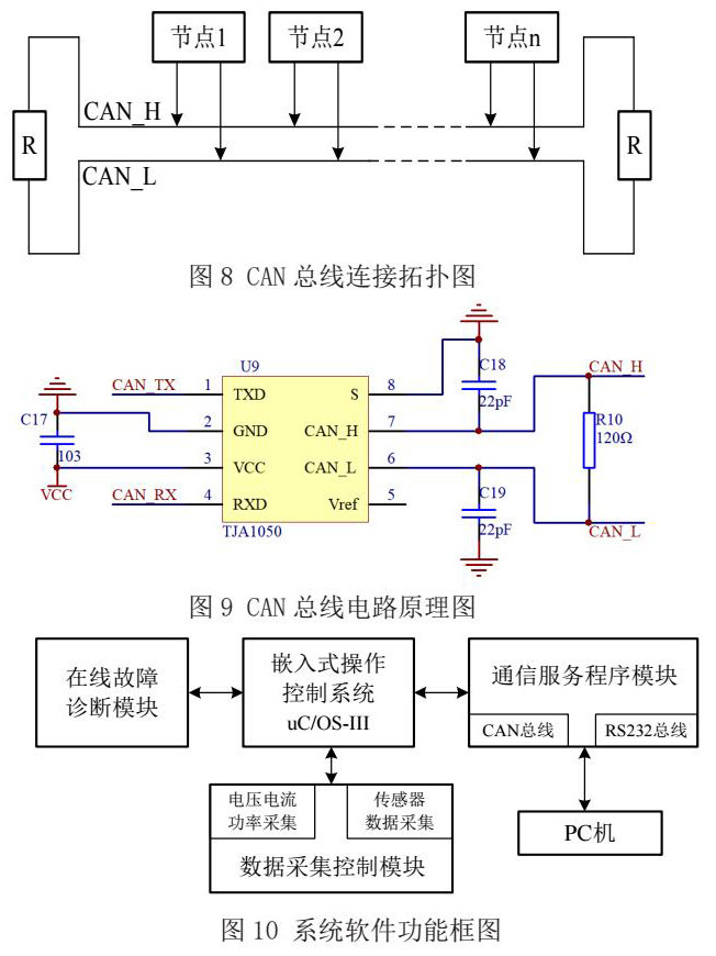 航电系统有多个模块,每个模块需配备一个数据采集子卡以实现对多个电路模块的健康管理,通过对CAN总线的了解,一条CAN总线上可以挂接多个CAN通信设备,CAN总线的通信方式有点类似广播的形式,当总线上的一个模块发送消息时,挂载在CAN总线上的其他模块都能接收到消息,而通过一些具体消息发送接收方式可以对特定模块进行消息传递[9]。CAN总线连接拓扑图如图8所示。
