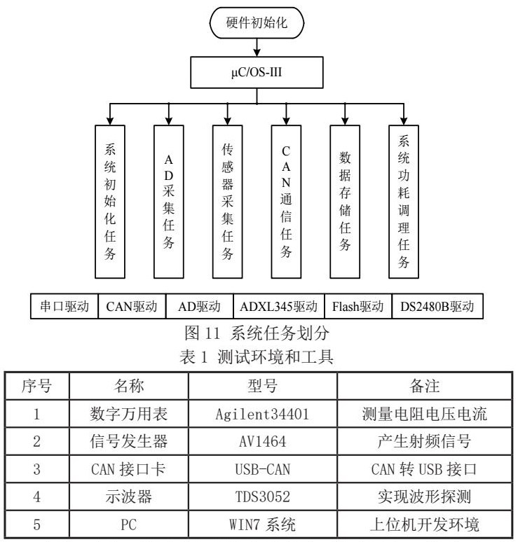 本系统主要任务包括系统初始化任务、AD采集任务、温度传感器采集任务、振动传感器采集任务、CAN通信任务、系统功耗调理任务、数据存储任务,图11为系统的各任务划分。系统底层驱动程序完成了对系统硬件的封装,各任务只需调用相应的驱动即能完成相应的功能。