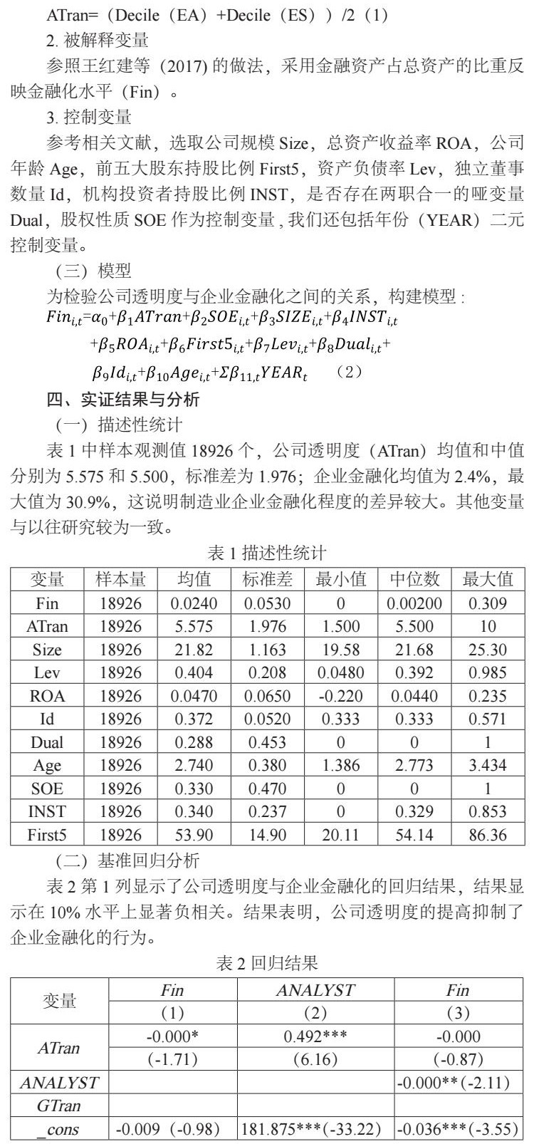 实体企业为了追逐利益,将重心不是放在主业上,而是放在并不擅长的金融资产投资上,一味的追逐利益导致企业承担财务风险,严重阻碍实体经济的发展。透明度的提高可以增加管理者的动力、帮助管理者制定决策。公司经理人短视行为的表现之一就是实体企业金融化,为了进行盈余管理不惜损害公司和股东的利益,影响公司可持续发展和价值提升。因此,从公司透明度角度研究对A股制造业公司金融化的影响具有现实意义。