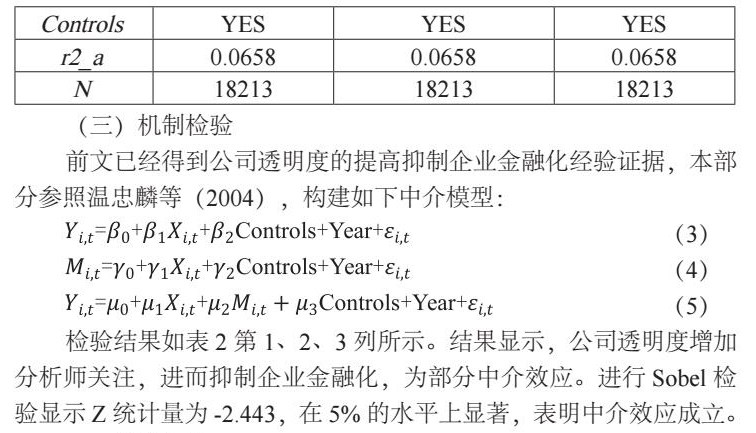 检验结果如表2第1、2、3列所示。结果显示,公司透明度增加分析师关注,进而抑制企业金融化,为部分中介效应。进行Sobel检验显示Z统计量为-2.443,在5%的水平上显著,表明中介效应成立。