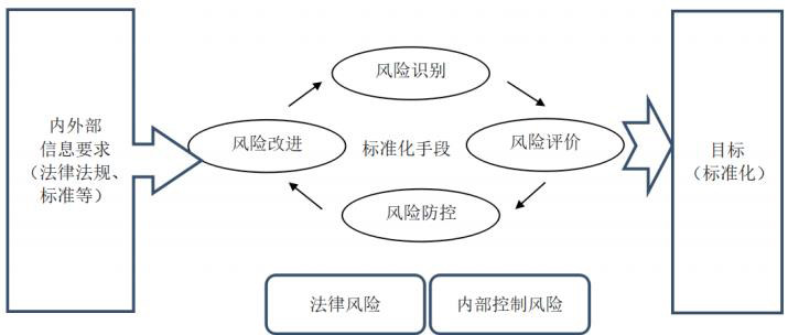 风险体系整合路径:以规范性文件(包括法律法规、规章制度、上级规范性文件)为依据,以业务流程为主线,以标准化文件为载体,建设“集中统一、重点突出、覆盖全面”的风险体系。具体路径如图所示: