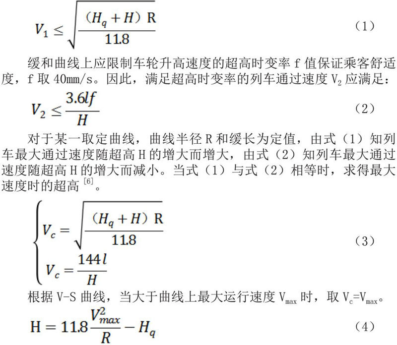 对于某一取定曲线,曲线半径R和缓长为定值,由式(1)知列车最大通过速度随超高H的增大而增大,由式(2)知列车最大通过速度随超高H的增大而减小。当式(1)与式(2)相等时,求得最大速度时的超高[6]。