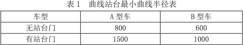 有效站台设置在曲线上时,曲线半径主要受车辆与站台边缘的间隙以及车体与站台门之间的间隙控制。无站台门时,曲线段车辆与站台边缘间隙按180mm控制,直线地段按70mm控制;有站台门时,曲线地段车体与站台门之间间隙按180mm控制,直线地段按130mm控制,结合A、B型车车辆参数可计算得出曲线站台的最小曲线半径[7]。