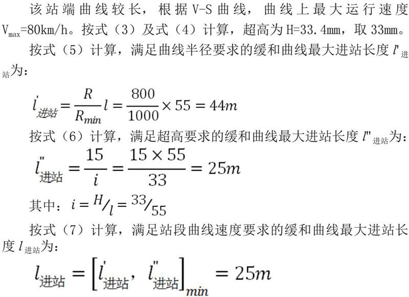 综上分析,在满足站段曲线速度要求的缓和曲线最大进站长度,取满足曲线半径要求的缓和曲线最大进站长度及满足超高要求的缓和曲线最大进站长度二者的最小值。