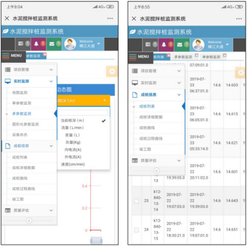 本项目采用水泥搅拌桩监测系统对成桩全过程进行记录,系统项目内容包括项目管理、实时监控、成桩信息、质量评估等。其中,实时检测的内容包括当前桩深、流量、灰 量、内外电流、速度等,成桩信息则可以进行记录。 实践证明,采用水泥搅拌桩监测系统对双向搅拌桩施工进行过程控制是一个直观、具体、有效的方法,可以在今后的施工中逐步推广采用。