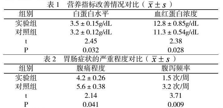 在本研究中,我们对基于肠内营养耐受评估的护理干预进行了调查,并发现了一些重要的结果。首先,实验组的病人在营养指标方面表现出显著改善,包括白蛋白水平和血红蛋白浓度,与对照组相比具有统计学意义。此外,实验组的胃肠症状,如腹痛和腹泻,也明显减轻,与对照组相比差异显著。这些发现强调了基于肠内营养耐受评估的护理干预在疾病管理中的潜在价值。