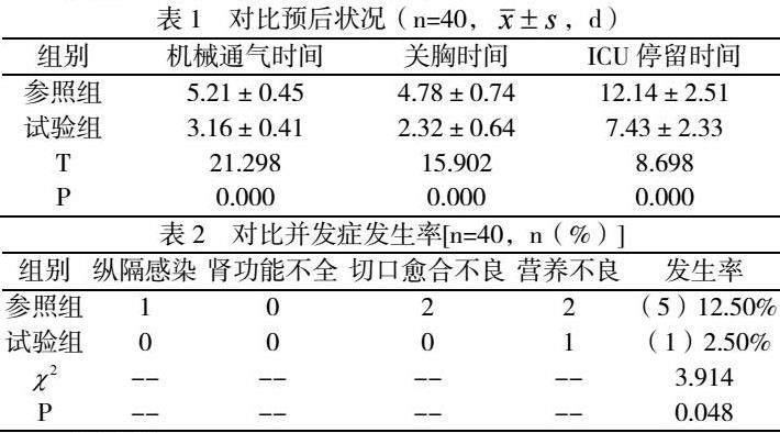 重症复杂先天性心脏病患儿在延迟关胸后易导致相关并发症发生,临床开展中仅辅以常规的护理工作虽可确保其具体安全性,但护理效果不能完全达到预期,可能会缺少预后质量的有效改善[3]。基于医护合作视角下开展相应的护理干预作为护理学发展新兴的护理模式,可将医疗工作与护理做以有效结合,依据患儿具体病情状况以及身心需求,制定科学的干预措施,保证手术效果的同时,减轻患儿诸多不适感,促进预后质量提升[4]。研究显示:试验组机械通气时间、关胸时间、ICU停留时间、并发症发生率等指标统计均较参照组有更佳数据表现(P<0.05),说明医护合作视角下开展护理干预对于重症复杂先天性心脏病患儿术后延迟关胸工作开展价值显著。实践中利用医护小组的建立,来实现深入合作,通过全面评估患儿状况,予以其生理、心理等方面的护理干预,可确保患儿身心得到改善,并保证护理服务的专业性、细致化[5-6]。