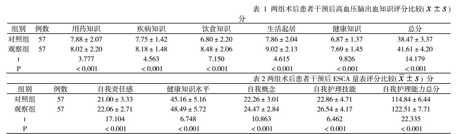 摘要:目的:探究综合护理干预对老年高血压脑出血患者术后的护理效果。方法:选择2021年3月-2021年12月,在此期间我院脑血管病外科一共接收了114例老年高血压脑出血患者,将患者随机分成对照组和观察组,每组57例。给予对照组患者常规护理,给予观察组患者在常规护理的基础上结合综合护理干预。结果:出院3个月后,观察组患者出院时在生活、饮食、运动等各项知识总得分明显高于对照组患者(P<0.05);同时观察组在自我护理能力上也要明显高于对照组患者(P<0.05)。结论:综合护理可以提升术后老年高血压脑出血患者自我护理能力,提高患者知识掌握程度。