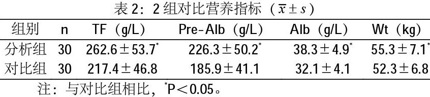研究结束后,2组对比各项营养指标数据,分析组均优于对比组(P<0.05)。如表2示。