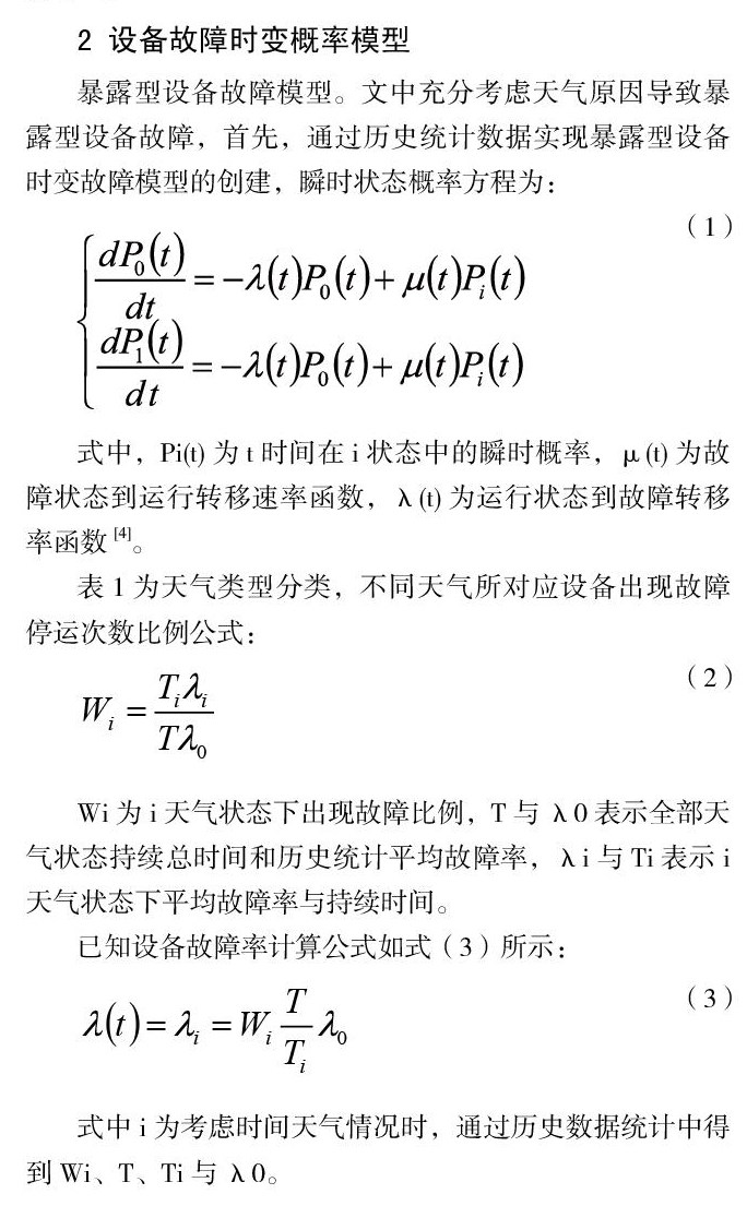 暴露型设备故障模型。文中充分考虑天气原因导致暴露型设备故障,首先,通过历史统计数据实现暴露型设备时变故障模型的创建,瞬时状态概率方程为: