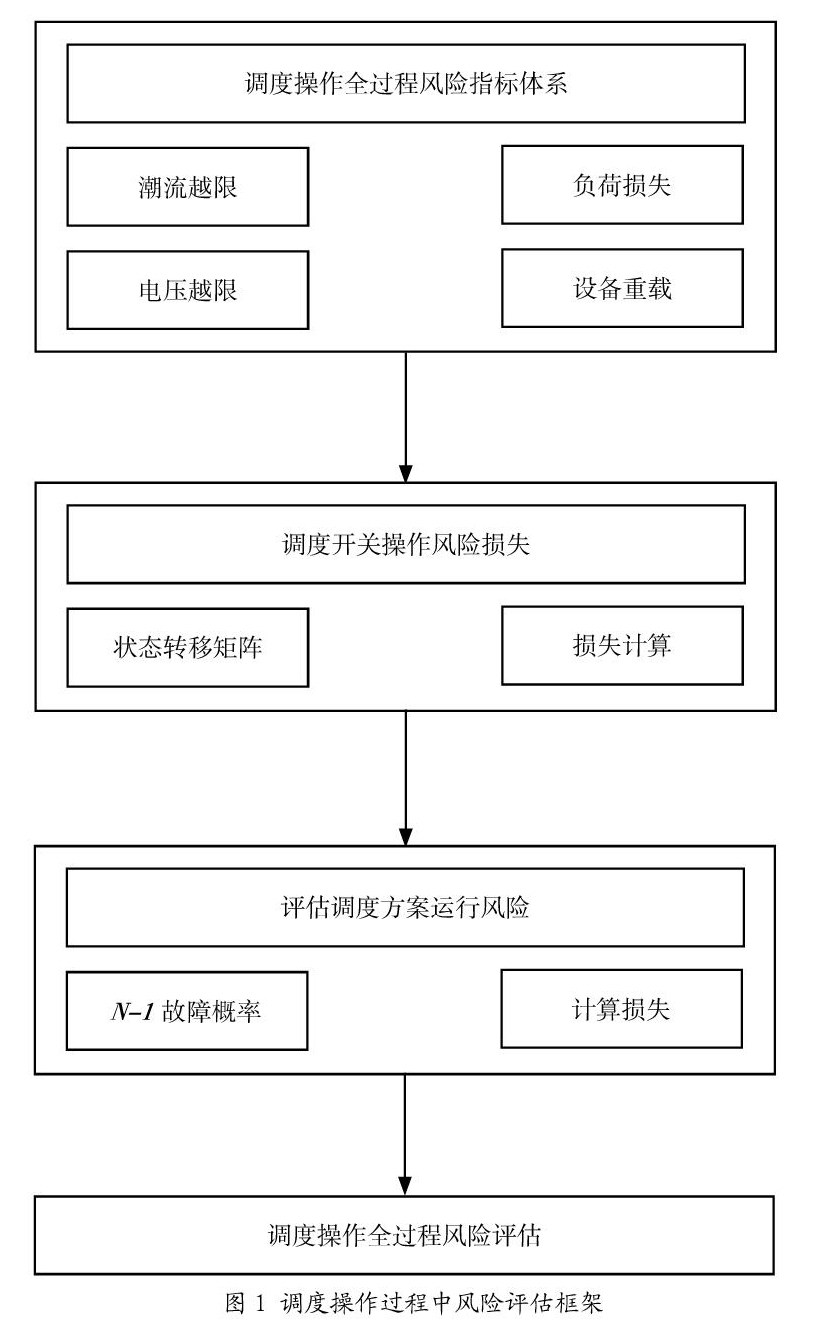 调度操作全过程风险包括:其一,如果调度操作开关操作失败,会导致电网风险的出现,比如关联母线故障导致的母线欠压;其二,执行调度方案后,系统N-1故障导致的运行风险;其三,执行调度方案之后长时间运行目标网络,电网存在潮流越限、电压越限等风险。后两者为成功调度操作后的电网运行风险,要共同考虑,文中对风险评估过程中发生故障概率与损失进行考虑。基于××电网运行经验与技术需求,设计调度操作过程中风险评估框架如图1所示[1]。