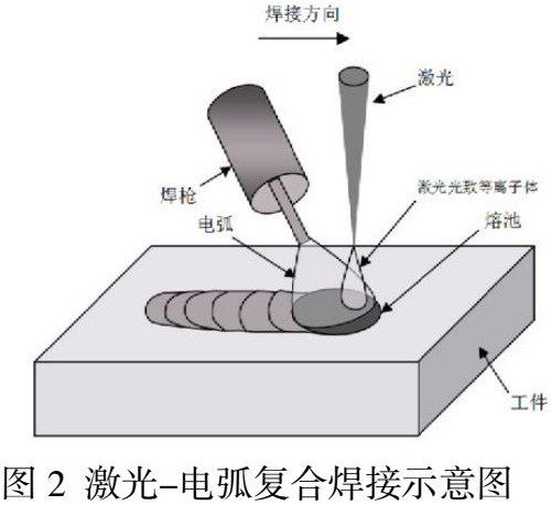 激光-电弧复合焊接技术是将不同激光热源(CO2、YAG等)和不同的电弧热源(TIG、MIG等)相结合,通过两种热源与工件相互作用的焊接方法,具有良好的焊接性,提高了焊接效率。两种热源充分利用各自的优势,具有“1+1>2”的效应[5]。如图2所示,为激光-电弧复合焊接示意图,该技术是目前国内外最具发展潜力的轻合金材料熔焊技术。