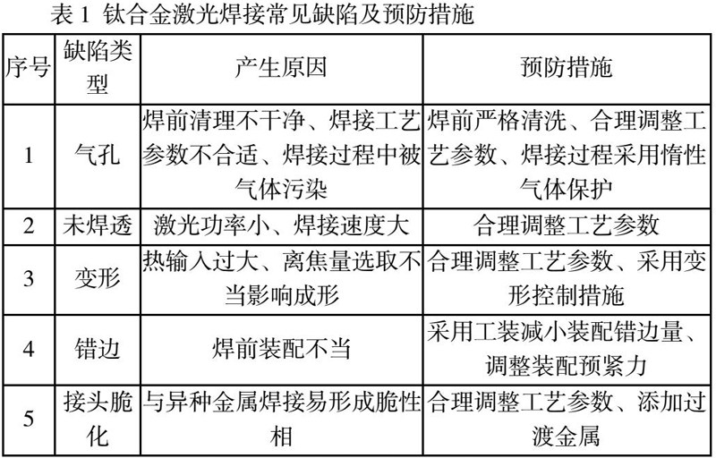钛合金具有强度高、耐腐蚀性优异等优点。由于钛合金也具有较高活性,焊接时在高温环境下能与空气中的氧、氮、碳等元素反应,生成脆性相,易产生裂纹、气孔等缺陷。钛合金激光焊接常见缺陷及预防措施,如表1所示。
