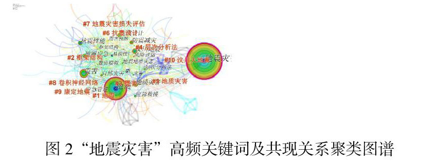 关键词是能够反映文章研究主题的精准词汇,是文章的研究核心,通过分析关键词的出现频率次数可以将相关领域的研究热点进一步显现。关键词又可以细分为三类。第一类是研究内容,主要开展防震减灾、抗震性能及抗震设计方向的研究;第二类是研究对象及区域,主要是针对汶川地震的研究;第三类是研究方法,主要是在新技术关于地震灾害的应用方面,如gis,数值模拟,层次分析法等。在中国“地震灾害”高频关键词及共现关系图谱中,最大的节点为“地震”,其次是地质灾害、汶川地震、抗震性能、抗震设计、防震减灾,出现频次在50次以上。通过citespace的聚类功能(图2),提取出了地震灾害领域的研究热点,前十依次为:地震、框架结构、震害、层次分析法、地质灾害、抗震设计、地震灾害损失评估、卷积神经网络、康定地震、汶川大地震。