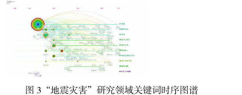 关键词的共现时区图谱是将关键词分时区展示,通过分析时区图,可以进一步了解该相关领域的研究内容方向随时间的变化。在“地震灾害”关键词时区图谱中,“地震灾害”“地震”“汶川地震”“震害”“抗震性能”“防震减灾”“地质灾害”“地震应急”“抗震设计”是其中的关键词,2012年~2015年的关键词共现较多,关联结构相对比较复杂,说明在此期间中国地震灾害研究视角和研究内容相当多元化。近几年来关键词结构相对简单,相关新技术的应用也突现较少,说明近几年中国的地震灾害研究领域研究热度相较2017年之前有所下降。在中国“地震灾害”研究领域关键词时序图谱中(图3),可以清晰地看到地震灾害研究领域各研究热点随时间的发展路线,可以看到各研究领域都在积极引入无人机、损伤评估ida、卷积神经网络、深度学习等新技术,新方法,使得研究范围及数据处理效率都有相当程度的提高。