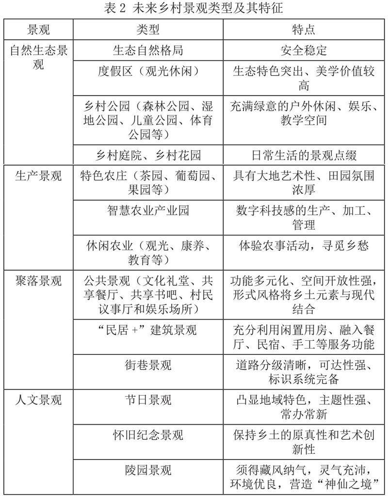 近几年国家大力扶助乡村振兴,乡村产业类型逐渐丰富,一二三产业互动格局不断优化,由此衍生出更多类型的乡村景观,比如乡村旅游凸显了景观的美学价值、生态价值和人文价值。传统生产景观出现分化,一类为营建自然田园风貌,另一类发挥科教展示功能;而随着乡村人口结构愈发丰富,为满足各类人群需求,公共景观的多样性显著提高;同时,人文景观的定位也更具特色和针对性。因此,预测未来乡村景观类型及特征见表2: