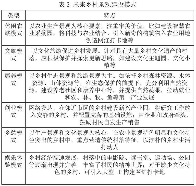 中国乡村分布广泛、在不同的地理位置、自然环境条件下,形成了不同的生产、生活和娱乐方式,也有了不同的文化、审美观和价值观,产生了各种各样的乡村景观发展模式。可以预见,未来乡村景观建设模式受到经济、交通和科学技术的影响将越来越大,并发挥自身特点逐渐走向分化的道路(表3)。