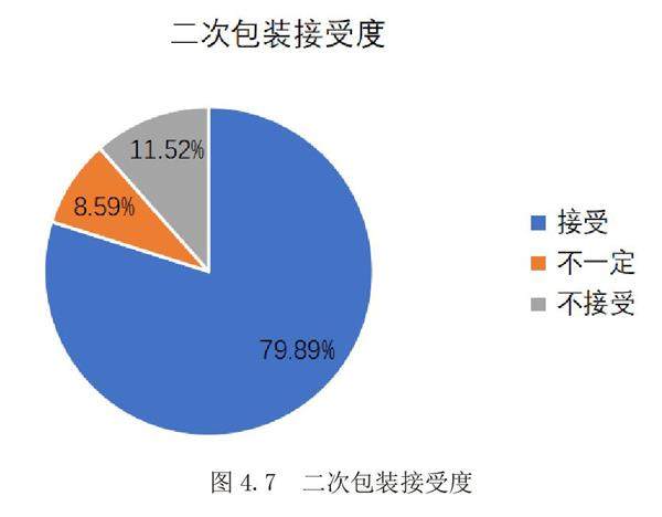 通过数据显示,我们可以看到79.89%的同学选择在包装不受损害的情况下接受二次包装,仅仅只有11.52%的同学选择不接受,调查了解到,大多数同学对于快递包装并没有过高的要求,满足基本的包装要求即可,更在意的还是里面的东西是否完整。