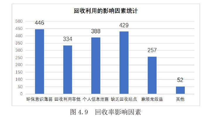 在对回收利用的影响因素统计中,有446位同学认为是因为自己的环保意识比较薄弱,429人认为回收站点缺乏,388人认为个人信息被遭到泄露,257人认为回收过程比较麻烦且对自己没有利益。因此个人以及学校需要在回收利用这方面要制定更加完善的体系,加强有学生权益的保护。