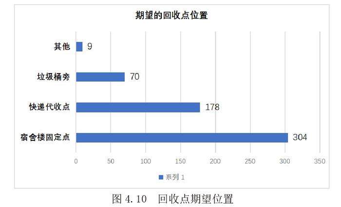 调查数据显示有304个人选择了希望将回收点放在宿舍楼固定点的位置,178人选择了在快递代收点,选择放在学校的垃圾桶旁的只有70人。我们可以了解到绝大部分同学更希望将回收站点设置在距离宿舍较近的地点,便于快递包装的投放。