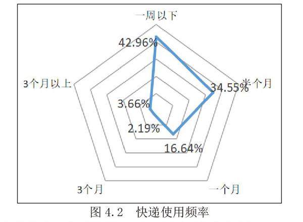 调查数据显示使用快递频率在一周以下的人数占比42.96%,半个月以上的为34.55%,还有16.64%的大学生一个月左右使用一次快递,仅3.66%的大学生很少使用快递,频率基本在3个月左右。因此,大部分人使用快递的频率介于一周到半个月,快递的需求量比较大。在当今互联网盛行的社会,大学容易受到广告的影响,喜欢追求新鲜事物,而且引导潮流,如今网购就是时尚的潮流,快递已成为日常生活中的一部分。