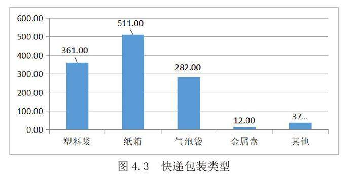 根据对快递包装材料的调查,快递包装材料中大部分使用的是塑料袋,纸箱以及气泡盒,分别占比总人数的66%,93.42%以及51.55%,而金属盒和其他材料的使用较少,占比调查人数的2.19%和6.76%。大学生普遍以生活用品和衣物为主,快递包装材料以塑料袋,气泡盒以及纸箱为主,其他材料为辅。