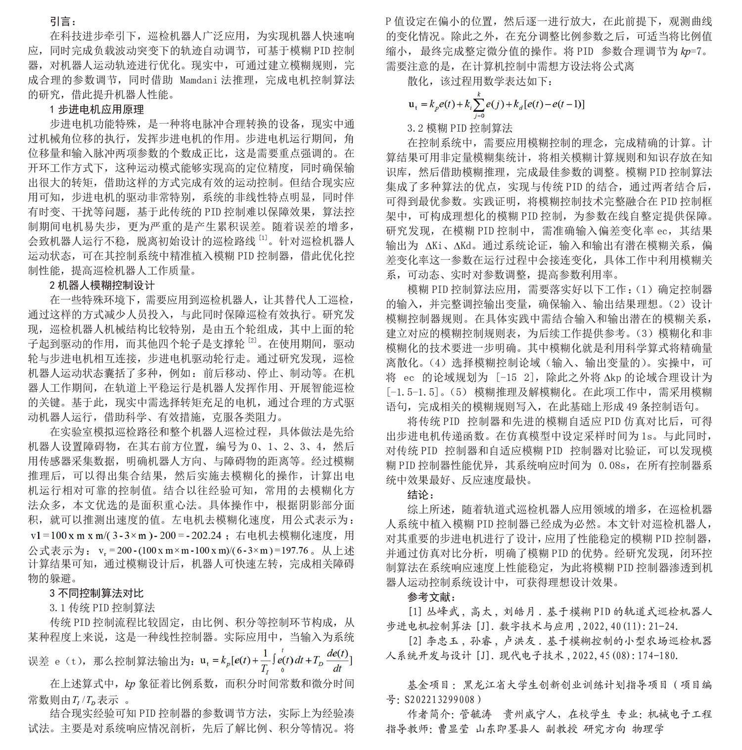 引言:在科技进步牵引下,巡检机器人广泛应用,为实现机器人快速响应,同时完成负载波动突变下的轨迹自动调节,可基于模糊PID控制器,对机器人运动轨迹进行优化。现实中,可通过建立模糊规则,完成合理的参数调节,同时借助 Mamdani法推理,完成电机控制算法的研究,借此提升机器人性能。