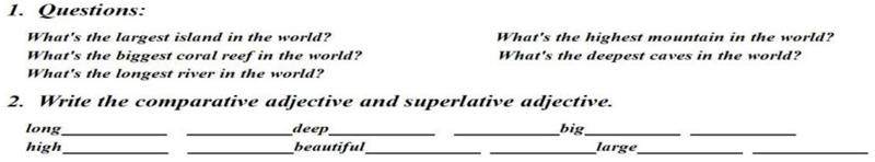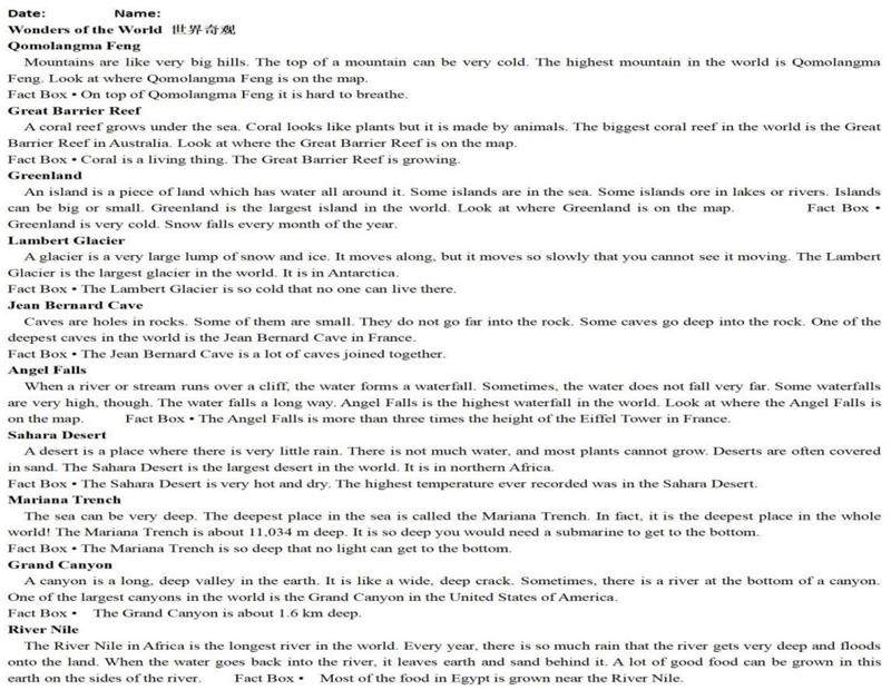 通过五个问题:What's the largest island in the world? What's the highest mountain in the world? What's the biggest coral reef in the world? What's the deepest caves in the world? What's the longest river in the world? 引发学生思考,调动学生已有知识经验,然后让学生带着问题听录音、阅读文章并找出问题答案,在精读讲解文章环节,可以通过图片和视频等多媒体手段,帮助学生更好的了解世界之最。最后复习一些常见的形容词比较级和最高级,帮助学生更好的讨论、分享他们对世界之最的观点和看法。