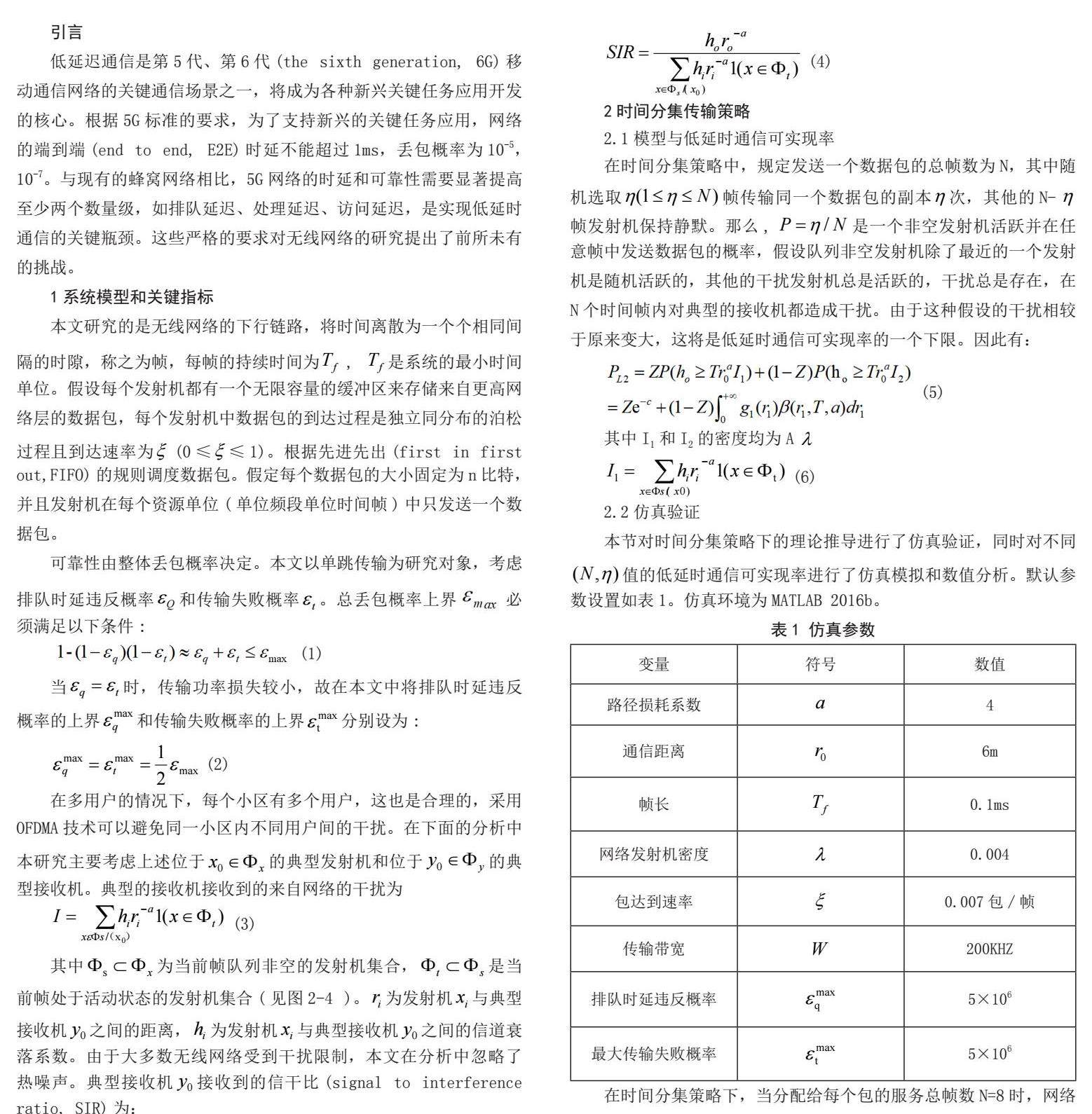 低延迟通信是第5代、第6代(the sixth generation, 6G)移动通信网络的关键通信场景之一,将成为各种新兴关键任务应用开发的核心。根据5G标准的要求,为了支持新兴的关键任务应用,网络的端到端(end to end, E2E)时延不能超过1ms,丢包概率为10-5,10-7。与现有的蜂窝网络相比,5G网络的时延和可靠性需要显著提高至少两个数量级,如排队延迟、处理延迟、访问延迟,是实现低延时通信的关键瓶颈。这些严格的要求对无线网络的研究提出了前所未有的挑战。