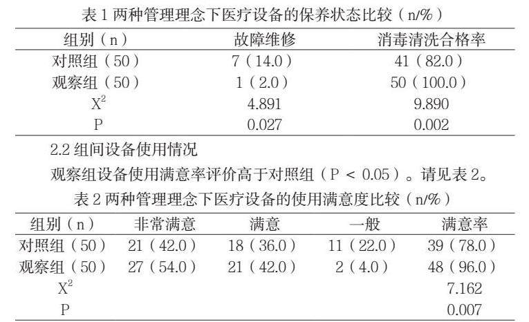 观察组:(1)定期培训科室医护人员,主要在于关于医疗设备的使用、运行观察等技巧,根据医疗设备的特点对其分类,一个机器一个档案并由专业人员管理;(2)建立管理制度。记录医疗设备的使用时长,确定对其检修维护时间,评估故障风险;合理调整每次维护内容;重视日常检查工作,并及时处理发现的问题;(3)定期检查医疗设备的库存情况,对于发生损坏或者损耗程度大的配件及时补充,确保医疗设备能够随时投入运行,保持在最佳状态;(4)设备维修。设备使用过程中一旦出现故障,要立即报修,检修之前由维修人员先对对应的档案信息查阅,并在档案中详细记录故障、维修情况;对于损坏的设备首先评估是否需要更换,如维修难度较小的直接进行处理。