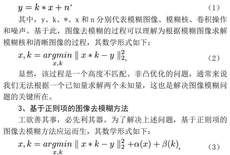 其中,y、k、*、x和n分别代表模糊图像、模糊核、卷积操作和噪声。基于此,图像去模糊的过程可以理解为根据模糊图像求解模糊核和清晰图像的过程,其数学形式如下: