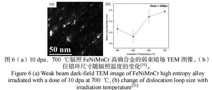 高熵合金在高能粒子辐照条件下会产生大量的点缺陷(空位和间隙原子),随着点缺陷的浓度升高,它们在材料中扩散聚集并形成不可见缺陷团簇或复合体;当点缺陷浓度继续升高到一定水平,会在材料中形成位错环、堆垛层错和孔洞等可见缺陷[48-50]。Kumar等[51]研究了FeNiMnCr高熵合金在3 MeV和5.8 MeV Ni+辐照下(辐照温度:室温至700 ℃;辐照剂量:0.03-10 dpa)辐照诱导缺陷的演化。结果表明,在所有温度下均观察到了高密度的位错环(1-10 nm);温度升高仅仅导致位错环平均尺寸略有增加,如图6所示;与传统的单相Fe-Cr-Ni奥氏体合金相比,该高熵合金具有更好的耐辐照性能。Lin等[47]利用分子动力学模拟的方法研究了NiCoCrFe高熵合金在辐照条件下辐照诱导缺陷的演化,并与纯金属Ni作对比。研究发现,在这两种材料中间隙团簇和空位团簇的大小或数量都随着初级撞出原子(Primary knock-on atom, PKA)能量的增加而增加,但在NiCoCrFe高熵合金中的增长速度较慢。高熵合金优异的耐辐照性能来源于高熵合金中原子级的化学无序。在电子层面上,化学无序状态往往会导致强烈的电子散射,从而显著降低电子的平均自由程,因此导致电子导率和热导率显著降低[13, 47]。在辐照条件下,低的电子导率和热导率使得高能离子轰击产生的缺陷能在较长时间内停留在局部,这有利于缺陷的重组[13, 47]。在原子层面上,化学无序使得缺陷的形成能和迁移能因局部原子环境不同而不同,因此,在高熵合金中空位和间隙原子的形成能和迁移能在分布范围上十分宽泛。与纯金属材料相比,高熵合金中缺陷的迁移会经历更加剧烈的能量起伏,这有利于局部低能位点将缺陷困在其中,并改变了缺陷的扩散路径和扩散机制[13, 47]。