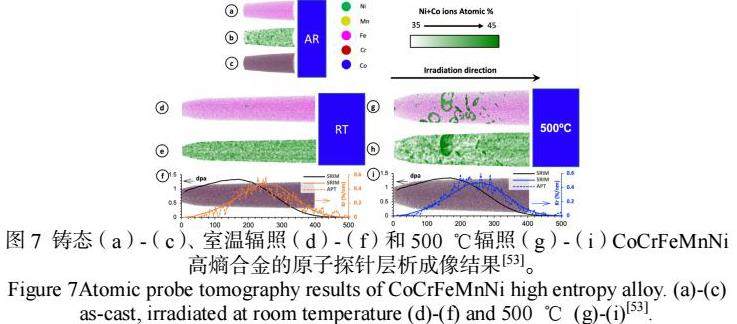 辐照致偏析是指在辐照条件下,材料中的原子或缺陷发生迁移,导致元素浓度的不均匀分布的现象。Chen等[52]研究了CrFeMnNi和AlCrFeMnNi高熵合金在5 MeV Fe2+辐照条件下(辐照温度:500 ℃;辐照剂量:50 dpa和100 dpa)的元素分布和相结构演变。结果显示,辐照前后高熵合金中的相组成一致,此外未观察到辐照导致的元素偏析,这表明高熵合金具有优异的相结构稳定性。Chen等[53]研究了CoCrFeMnNi高熵合金在1 MeV Kr+辐照条件下(辐照温度:室温和500 ℃;辐照注量:6.3 × 1018 ions/m2)的元素分布变化。结果显示,室温辐照条件下,高熵合金无元素偏析现象;但在500 ℃辐照条件下,Co和Ni在位错环周围偏析,如图7所示。Sun等[45]研究了在80 eV He+辐照条件下(辐照温度:室温;辐照注量:6 × 1018 ~ 1.8 × 1021 ions/cm2)BCC结构Al1.5CrFeNi高熵合金的元素偏析行为和相结构演变。研究发现,在6 × 1018 ions/cm2的辐照注量下,高熵合金中未发生元素偏析;但当辐照注量升高至1.8 × 1021 ions/cm2后,高熵合金中Cr元素发生严重偏析,其相结构由单一BCC变为FCC+BCC+BCC1。这些实验结果表明,高熵合金在辐照条件下的相结构稳定性和元素偏析行为与高熵合金体系和辐照条件密切相关。