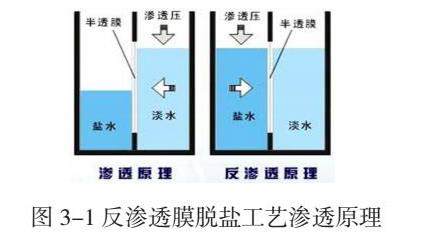 反渗透膜脱盐工艺(图3-1):反渗透技术,是当今最先进和最节能有效的膜分离技术。其原理是在高于溶液渗透压的作用下,依据其他物质不能透过半透膜而将这些物质和水分离开来。由于反渗透膜的膜孔径非常小(仅为10A左右),因此能够有效地去除水中的溶解盐类、胶体、微生物、有机物等(去除率高达97%-98%)。反渗透是目前高纯水设备中应用最广泛的一种脱盐技术,它的分离对象是溶液中的离子范围和分子量几百的有机物;反渗透(RO)、超过滤(UF)、微孔膜过滤(MF)和电渗析(EDI)技术都属于膜分离技术[4]。