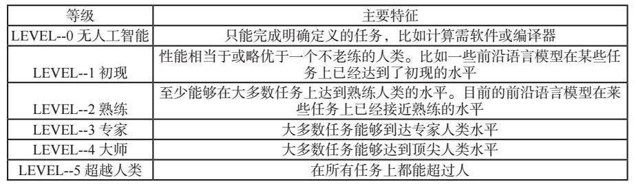 为了更好地理解和评估人工智能的发展水平,人们通常根据模型性能和学习处理任务的广泛性,将人工智能划分为六个等级,从Level-0的无人工智能,逐步提升至Level-5的超越人类智能。Level-0代表了完全没有人工智能参与的阶段,而Level-5则预示着人工智能在各个方面都达到了甚至超越了人类的智能水平。